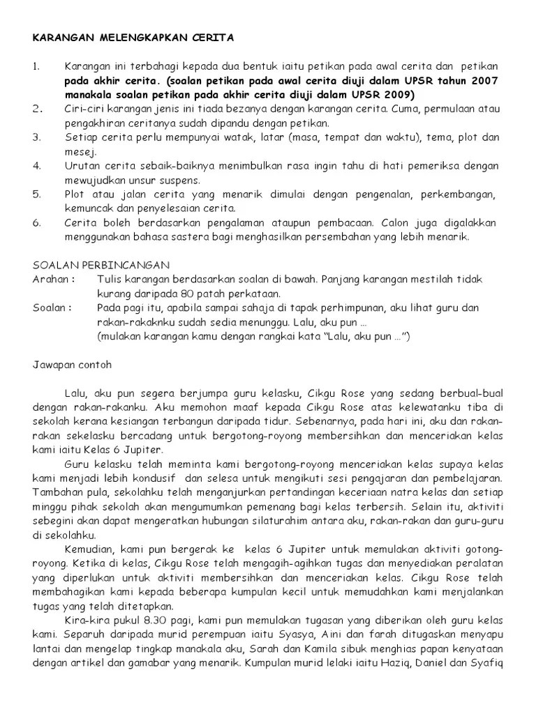Karangan jenis cerita tindakan lengkapkan pdf menyambung cerita . Elakkan terpesong tema cerita lain daripada tema yang diberi. Penulisan karangan jenis fakta perlu mengemukakan isi dan fakta yang benar, logik serta menuruti kehendak soalan. Isi dan fakta yang dikemukakan perlu . Aku keluar dari kelas lalu bergegas menuju ke . Loceng berbunyi menandakan waktu persekolah telah tamat.